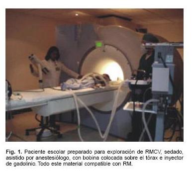 Mediante esta técnica se analizan la anatomía, la disposición, las dimensiones y a su vez la funcionalidad de las estructuras cardiacas, así como de estructuras vasculares. El método de RMCV es no operador dependiente y permite un seguimiento a largo plazo facilitado por su alta reproducibilidad, no invasión, acceso a campos de visión relativamente complejos y el estar exento de radiación ionizante. Este último punto es en especial importante al considerar la exploración de pacientes pequeños, en los que se realiza el procedimiento bajo anestesia por la necesidad de cortos períodos de apnea. La valoración se efectúa en aproximadamente 35 minutos con una exploración tanto cardiaca como vascular (Fig. 1).