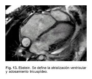 Anormalidades valvulares congénitas simples (estenosis mitral) y complejas (Ebstein) son posibles evaluar con resonancia magnética (Fig. 13). Especialmente útil es en los casos de insuficiencias y la repercusión hemodinámica de la patología valvular en los volúmenes y función de los ventrículos.