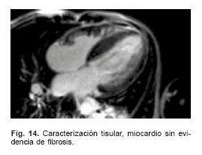 La tetralogía de Fallot es bien caracterizada por resonancia magnética tanto en el diagnóstico y caracterización inicial como en el seguimiento. La tetralogía incluye cabalgamiento de la aorta, defecto septal membranoso, estenosis pulmonar infundibular e hipertrofia ventricular derecha, en algunos casos además de estenosis de las arterias pulmonares y en casos severos colaterales pulmonares. Se realiza una exploración completa para realizar una caracterización de la patología ya diagnosticada por ecocardiografía.6 La valoración de función ventricular así como de caracterización tisular para descartar fibrosis miocárdica son de vital importancia como factor pronóstico del paciente llevado a corrección. El seguimiento de adultos corregidos es altamente reproducible y permite valorar la función ventricular derecha6,7 (Fig. 14).