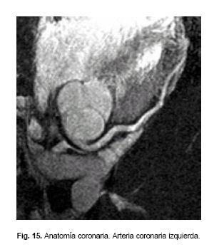La resonancia magnética es de utilidad en el diagnóstico de patología congénita o inflamatoria de las arterias coronarias, como es el caso de la enfermedad de Kawasaki. En el origen anómalo de las arterias coronarias se caracterizan los troncos principales así como vistas inaccesibles como es el caso del trayecto aortopulmonar (Fig. 15). En el caso de enfermedad de Kawasaki se delimita el tronco de las coronarias con caracterización de los aneurismas y valoración de permeabilidad de los mismos. Se realiza una valoración cardíaca integral con diámetros ventriculares, valoración de la movilidad y engrasamiento miocárdico. Así como también se identifican y delimitan zonas necróticas miocárdicas, lo cual es de importante valor pronóstico. El seguimiento es posible en estos pacientes sin condicionar afección ya que se trata de un método no invasivo (Fig. 16).