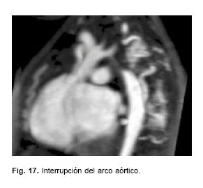 La RMCV muestra a detalle las características de los anillos vasculares, su relación con anomalías del arco aórtico y otras estructuras. El doble arco aórtico condiciona compresión de la tráquea y el esófago bien caracterizado con una angiorresonancia. En el caso de anomalías en la emergencia de la subclavia izquierda es posible seguir el trayecto claramente y determinar si condiciona algún compromiso. En el caso de interrupción de aorta (Fig. 18) el método permite definir la localización exacta, así como el conducto arterioso asociado y la repercusión de la patología. En niños la determinación del conducto arterioso persistente se realiza con ecocardiografía; sin embargo la RM complementa la información en caso de existir asociación a alguna otra patología. En el paciente adulto es necesaria la exploración con RM ante la sospecha clínica de cortocircuito sin lograr demostrarlo con ecocardiografía.8,9