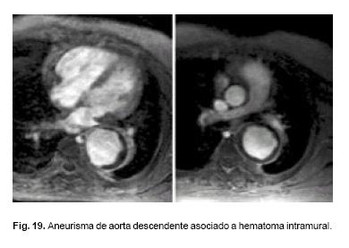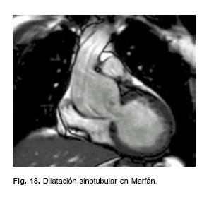 El desarrollo de aneurismas en esta patología es de gran importancia en el pronóstico. La cirugía profiláctica y en especial la terapia endovascular han contribuido a incrementar la sobrevida en estos pacientes. El método permite un seguimiento estrecho del diámetro aórtico, función valvular aórtica y ventricular izquierda. Se realiza una exploración completa de aorta con adquisición en planos axiales y coronales en cines eco de gradiente de la raíz en donde se caracteriza claramente la porción sinotubular2 (Fig. 19). Por lo general se complementa con angiorresonancia para caracterización completa de la aorta y cortes axiales de cines en diversos niveles para valorar la distensibilidad de la misma. En el caso de complicaciones como es la disección se valora la localización y extensión involucrada, el sitio de entrada, la integridad del FLAP, diámetro y trayecto de la luz verdadera y falsa, se determina el compromiso de troncos supraaórticos y emergencia de arterias viscerales (Fig. 20). Se aplica en estos casos cines eco de gradiente, mapeos de flujo y angiorresonancia. Todo esto para normar la conducta terapéutica que por lo general es combinada (cirugíaterapia endovascular). El enfoque multidisciplinario en estos pacientes es de vital importancia. Posterior al manejo, en el caso de colocación de endoprótesis se realiza seguimiento de la exclusión de la luz falsa y remodelación de la pared de la aorta.