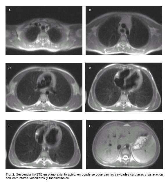 En un examen completo de las cardiopatías congénitas se aplica el siguiente protocolo: Obtención de imágenes ortogonales (sagital, axial, coronal) en secuencia turbo spin echo, HASTE, con la finalidad de realizar una valoración inicial de la disposición, morfología y dimensiones de las cavidades cardíacas, su relación con las estructuras vasculares y resto de estructuras mediastinales; así como configuración de los hemitórax2 (Fig. 2). La información funcional es obtenida con secuencias cine eco de gradiente en los planos cuatro cámaras, eje corto ventricular de la base al ápex, tractos de salida ventriculares y sagital oblicuo de la aorta (Fig. 3). Estos datos son analizados para obtener la función ventricular, volúmenes y masa tanto izquierda como derecha con un software denominado ARGUS o bien MASS.