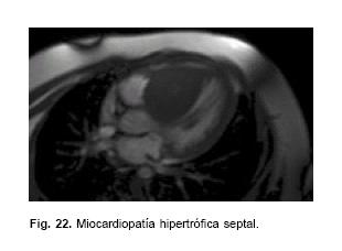 En el caso de la miocardiopatía hipertrófica, restrictiva y dilatada se evalúan con una exploración única, no invasiva en la que se valora la morfología de ambos ventrículos con obtención de volúmenes ventriculares tanto izquierdo como derecho, masa, engrasamiento y caracterización tisular. Para esto último se aplica material de contraste endovenoso y se determina un patrón de reforzamiento tardío, que puede orientar hacia alguna patología específica, como sería la fibroelastosis endomiocárdica en el caso de una miocardiopatía restrictiva. En el caso de la miocardiopatía hipertrófica se caracteriza la afección, se valora si existe compromiso del tracto de salida del ventrículo izquierdo y posterior a la administración del material de contraste endovenoso se determinan zonas fibróticas las cuales son potenciales focos arritmogénicos, lo que nos demuestra el importante valor pronóstico del método2,3 (Figs. 21 y 22).
