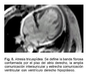 Existe doble entrada a un ventrículo cuando la mayor parte del diámetro de los orificios atrioventriculares de una válvula atrioventricular común se conecta a uno de los ventrículos (Fig. 7). Y se conoce como ausencia de una conexión atrioventricular a aquel tipo de conexión en el que falta una de las válvulas atrioventriculares. Como es el caso de la atresia tricuspídea, en la que el atrio derecho no se conecta a la masa ventricular; está separado del corazón por el surco atrioventricular y el atrio derecho se comunica con el izquierdo por medio de un defecto septal interatrial3 (Fig. 8).