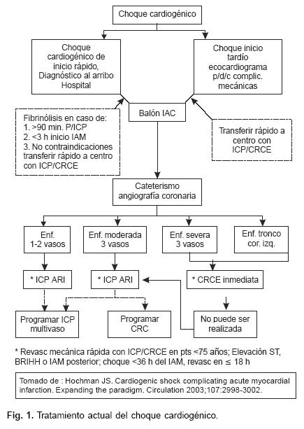 Los lineamientos actuales sobre manejo del CHC por parte del panel de expertos del Colegio Americano de Cardiología y de la Asociación Americana del Corazón (ACC/AHA), sugiere recomendación clase I para realizar ICP primaria o cirugía de revascularización coronaria de emergencia (CRCE) en pts menores de 75 años de edad con IAM con elevación del segmento ST que desarrollen choque en las 36 h de inicio del IAM y que puedan ser tratados en las siguientes 18 h de inicio del estado de CHC. Se considera razonable (Clase Ha) realizar ICP o CRCE en pts seleccionados con edad >75 años.10 La Figura 1 sugiere un flujograma de manejo para pts con CHC.