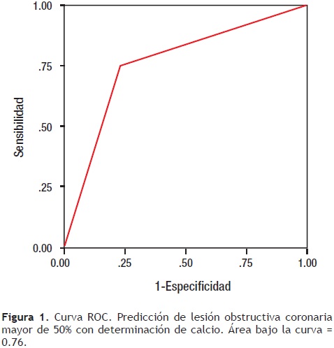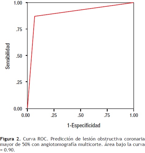 La presencia de CC > 400 UA para predecir lesiones obstructivas coronarias en estos enfermos mostró sensibilidad de 37.5%, especificidad de 98.2%, VPP de 75%, VPN de 91.6% y exactitud de 90.6%, mientras la determinación de lesiones obstructivas coronarias con TCMC, tuvo sensibilidad de 87.5%, especificidad de 92.8%, VPP de 63.6%, VPN de 98.1% y exactitud de 92.5%. Las Figuras 1 y 2 muestran el análisis ROC, en donde el área bajo la curva de presencia de CC >400 UA fue de 0.76 y de la TCMC de 0.90.