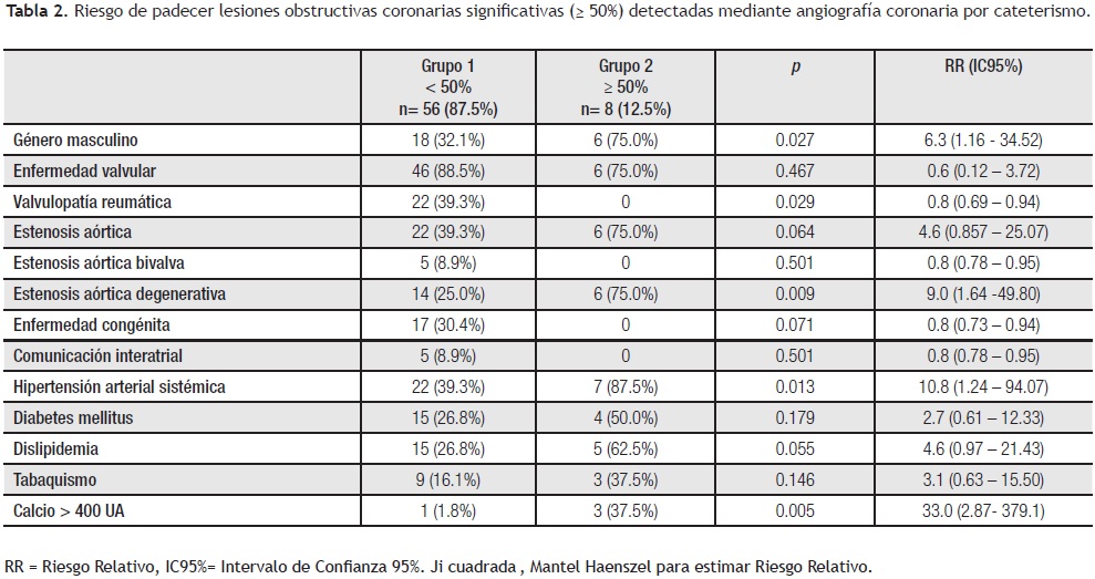 Resultados: La prevalencia de obstrucción coronaria mayor de 50% fue 12.5%. La tomografía coronaria multicorte mostró sensibilidad de 87.5%, especificidad de 92.8%, valor predictivo negativo de 98.1% y área bajo la curva de 0.90, para predecir obstrucción coronaria. Ningún paciente con valvulopatía reumática tuvo obstrucción coronaria mayor de 50% o score de calcio > 400 U A (RR = 0.80, IC 95% 0.690.94). La estenosis valvular aórtica degenerativa tuvo mayor probabilidad de obstrucción coronaria mayor de 50% (RR = 9.0: IC 95% 1.6449.8). Con análisis multivariado usando regresión logística, el score de calcio mayor de 400 UA (Coef ß 0.342, t = 4.297, p = 0.000) y sexo masculino (Coef ß 0.174, t = 2.214, p = 0.031), fueron las variables predictoras de más peso. Este estudio muestra poblaciones diferentes en el grupo de pacientes que van a cirugía cardiaca no coronaria.