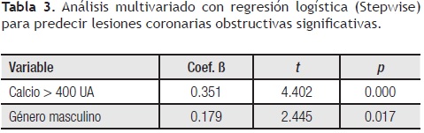 Los mejores predictores de lesiones coronarias significativas de manera independiente mediante análisis multivariado con regresión logística (Stepwise) son la presencia de CC > 400 UA y el género masculino (Tabla 3).