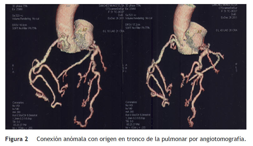 Se trata de una paciente de 51 años quien ingresa de forma electiva para cateterismo cardiaco como protocolo quirúrgico para recambio valvular por disfunción protésica mitral donde como hallazgo anexo a inmovilidad unidiscal se encuentra conexión anómala de la coronaria izquierda al tronco de la arteria pulmonar hallazgo que no se tenía documentado previamente; la paciente tenía antecedente de prolapso congénito de la válvula mitral con colocación de prótesis hace 15 años tipo St. Jude enviada a valoración preoperatoria por ortopedia para cirugía artroscópica; por antecedente de gonartrosis se solicita ecocardiograma y se detecta estenosis de la prótesis por pannus con gradiente medio de 14 mmHg; se presenta en sesión medicoquirúrgica por la alteración valvular mencionada, decidiéndose ingreso para cateterismo. En la sesión se plantea la necesidad de reintervención quirúrgica para recambio valvular mitral y reimplante de la arteria coronaria izquierda a la aorta; se realizó angiotomografía como complementación diagnóstica (figs. 1 y 2).