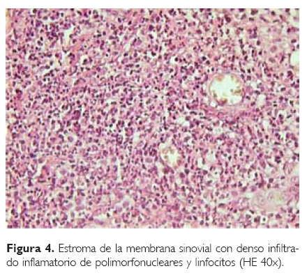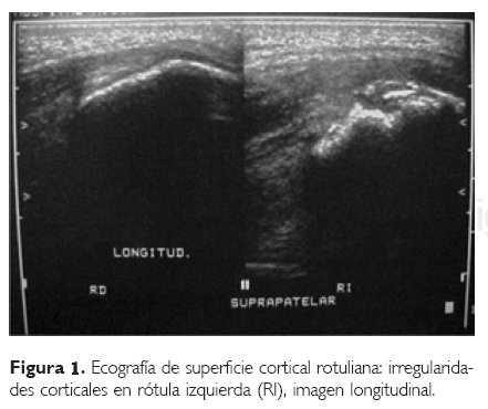 Se trata de un paciente masculino con diabetes tipo 1 de 14 años de edad en tratamiento con insulina que presentó artritis de rodilla y fiebre luego de un traumatismo directo sobre la rótula izquierda con la punta de unas pinzas metálicas que produjeron una pequeña solución de continuidad a nivel de la piel, lo que inicialmente no llevó al paciente a buscar atención médica. Durante las siguientes tres semanas presentó inflamación y dolor de la rodilla con limitación de la movilidad, así como fiebre de 39° C. Fue tratado con antiinflamatorios no esteroideos y antibióticos orales en forma empírica sin haber mostrado mejoría. Ante la persistencia del cuadro clínico se valoró por el servicio de pediatría, el que solicitó estudio de radiología simple sin mostrar alteraciones evidentes. Como parte del protocolo de estudio se realizó revisión mediante ultrasonido músculo-esquelético de rodilla izquierda, que mostró irregularidades sobre la cortical rotuliana no presentes en la rótula contralateral y no visibles por radiología simple (Fig. 1). El estudio gammagráfico demostró hipercaptación a nivel de rótula izquierda (Fig. 2). En el ultrasonido de rodilla también se observó derrame articular y sinovitis (Fig. 3). Mediante punción se obtuvo un cultivo de líquido sinovial (inicial) negativo. Debido a la persistencia de derrame a pesar del drenaje por artrocentesis, y a la presencia de sinovitis, se decidió intervenir quirúrgicamente, observando en el estudio histológico sinovitis fibrinopurulenta, con aislamiento de Pseudomonas aeruginosa en cultivo de tejido (Fig. 4). Se indicó tratamiento con ceftazidima intravenosa por cuatro semanas (100 mg/kg/día) seguidas de ciprofloxacino por seis semanas más por vía oral (30 mg/kg/día). El tratamiento utilizado resultó en la remisión completa de los síntomas. El paciente fue valorado seis meses después encontrándose asintomático.