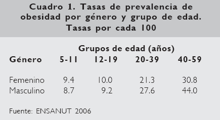 El panorama de la obesidad en niños mexicanos puede observarse a partir de los datos presentados recientemente en México en diferentes estudios nacionales.5-7 La prevalencia combinada de sobrepeso y obesidad en niños de 5 a 11 años fue de alrededor de 26% para ambos sexos, 26.8% en niñas y 25.9% en niños (un incremento de 39.7% respecto a 1999, que fue de 18.6%; 20.2% en niñas y 17% en niños). En lo que respecta a la prevalencia de obesidad, ésta se incrementó para el grupo de 5 a 11 años de edad en el período de 1999 a 2006; pasó de 5.3 a 9.4% en niños y de 5.9 a 8.7% en niñas. Si bien, las razones que explican el incremento no son totalmente claras, se sabe que el estilo de vida con una actividad física disminuida y un consumo excesivo de alimentos pueden ser las causas básicas de esta tendencia.1