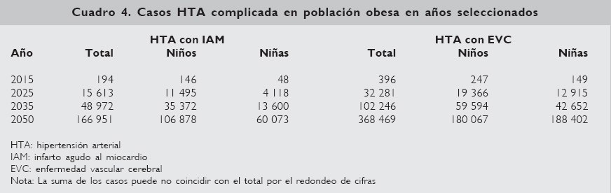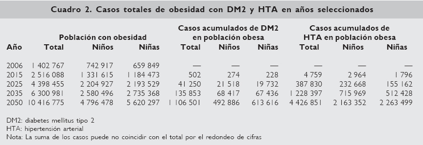 El cuadro 2 presenta el número de casos totales con obesidad por género en años seleccionados y los casos anuales por morbilidad DM2 e HTA entre la población obesa del año correspondiente. Para el año 2050, 57.3% de la cohorte presenta obesidad, distribuido en 54% en las niñas y 46% en los niños. Como se puede observar, para los años 2035 y 2050 el número de casos con HTA aumenta considerablemente; de forma que para 2050 cursarán con HTA, aproximadamente 42.5% de las personas obesas. Por su parte, la prevalencía de diabetes será de 10.6%.
