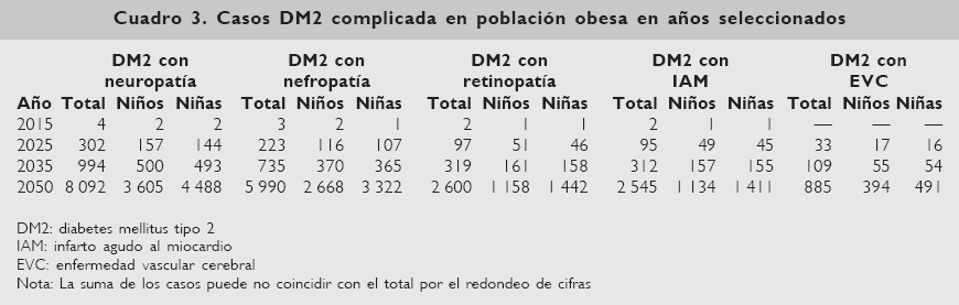 Los cuadros 3 y 4 presentan los resultados por tipo de morbilidad y complicaciones asociadas. Se puede observar que las complicaciones empiezan a ser más notables a partir de 2035, sobre todo las asociadas a hipertensión. En cuanto a las complicaciones de la DM2, todos los años se observaría mayor frecuencia de los casos de neuropatía. Resalta el hecho de que el mayor número de complicaciones en población diabética ocurriría entre las niñas, mientras que en las relativas a la hipertensión se observaría entre los niños.