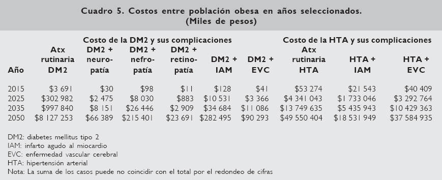 El cuadro 5 indica el costo anual total atribuible a las complicaciones de la obesidad considerando un costo de atención rutinario de la DM2 y la HTA, y la estimación de la atención a los eventos de sus respectivas complicaciones según el año indicado. De igual forma que en los casos, el costo que genera la HTA y sus complicaciones es mayor en términos relativos a aquéllos correspondientes a la DM2, efecto que puede deberse a la asignación de costos y complicaciones, ya que las tasas de DM2 y sus complicaciones aumentan conforme la edad y son más elevadas a partir de los 60 años.