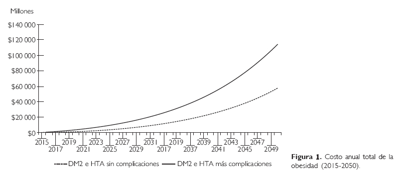 En lo que respecta a los costos, no se presentan los correspondientes a la atención de la obesidad, ya que no se tiene hasta el momento un estimado preciso; por tanto, el costo presentado corresponde al imputado por las complicaciones causadas por obesidad, en este caso por DM2 e HTA, con sus respectivas complicaciones.