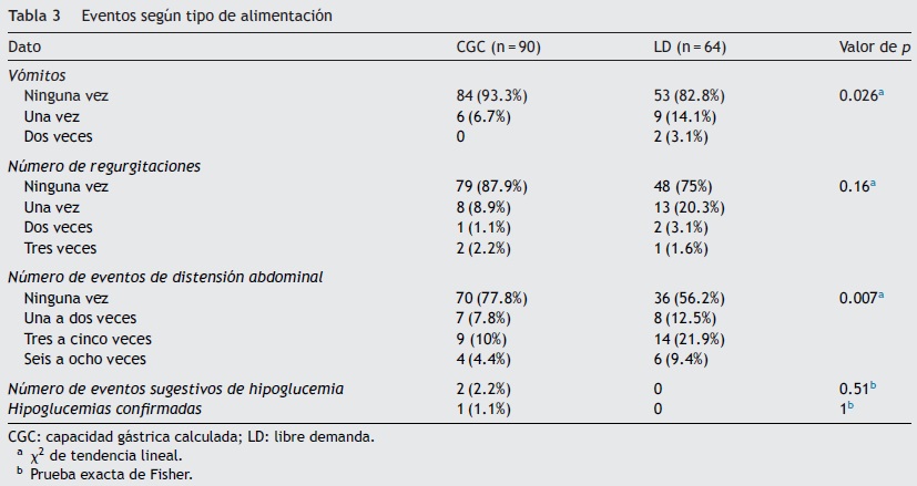 Es importante comentar que durante el estudio hubo excepciones a la indicación en el grupo con CGC. Lo anterior se toleró ante los aspectos éticos del estudio, donde el criterio del médico o de la enfermera responsable durante la vigilancia fue respetado. También nos permitió establecer el efecto de la sobre o subalimentación en los datos de tolerancia. De esta forma, se confirmó la presencia de mayor número de vómitos ante alimentaciones mayores a la capacidad gástrica calculada.