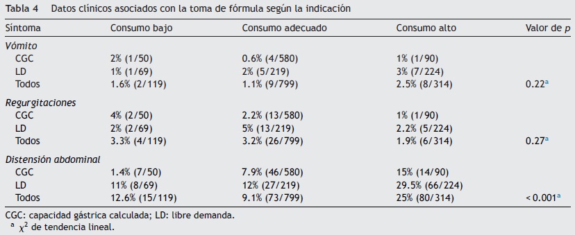 Para determinar si los síntomas presentados por los neonatos estuvieron relacionados con la cantidad de fórmula ingerida en la toma anterior, se estimó la tasa de eventos por cada 100 consumos según el tipo de ingesta: baja (< 10% CGC), adecuada o alta (> 10% CGC). Se observó que tanto la presencia de vómitos como de regurgitaciones no se relacionaron con el volumen consumido (tabla 4). La tasa de eventos fue muy semejante, incluso si la indicación fue por CGC o a LD.