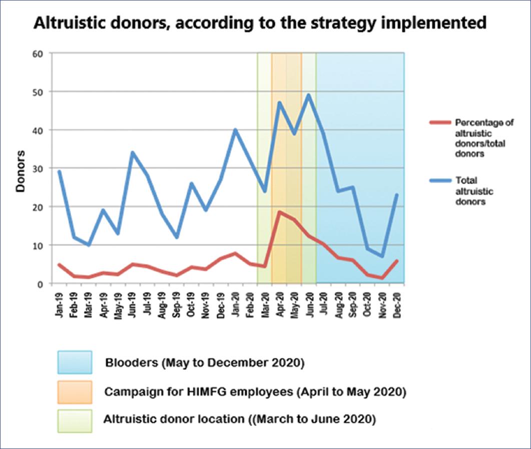 Data from the 2019 HIMFG blood bank were compared with those from 2020, specifically in the months in which donor recruitment strategies were used, dividing the strategies into those focused on altruistic and family donation. Data from all accepted donors were considered.