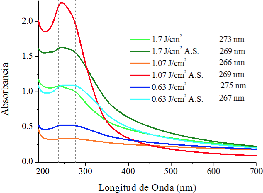 Los espectros de absorción óptica de los distintos coloides con las diferentes nanoestructuras de Bi preparadas se presentan en la Figura 2. Se puede observar una banda de absorción alrededor de los 270 nm, la cual es característica del plasmón de superficie de nanopartículas de bismuto con diámetros del orden de 10 nm [11]. Adicionalmente, se observa que la absorbancia se incrementa con la fluencia, lo cual se debe a que se forma un mayor número de nanopartículas.