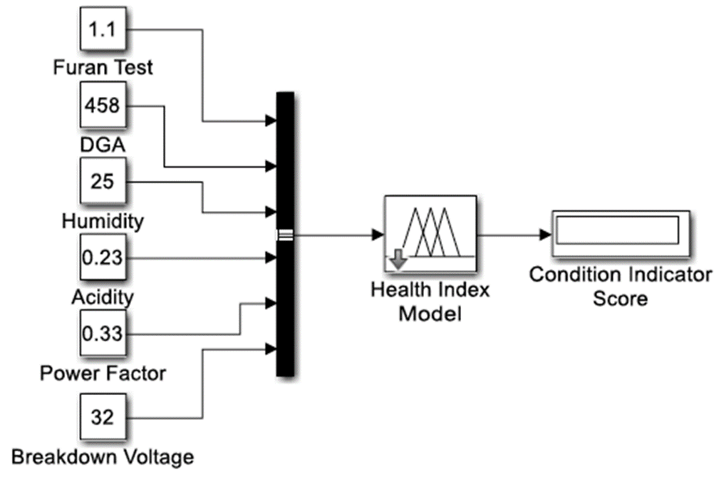 A Mamdani FIS composed by 80 rules is used to integrate the six linguistic inputs with the output. Once the output membership function is obtained, a defuzzification process takes place to convert the linguistic HI into a numerical value. The complete HI fuzzy model can be observed in Figure 2.