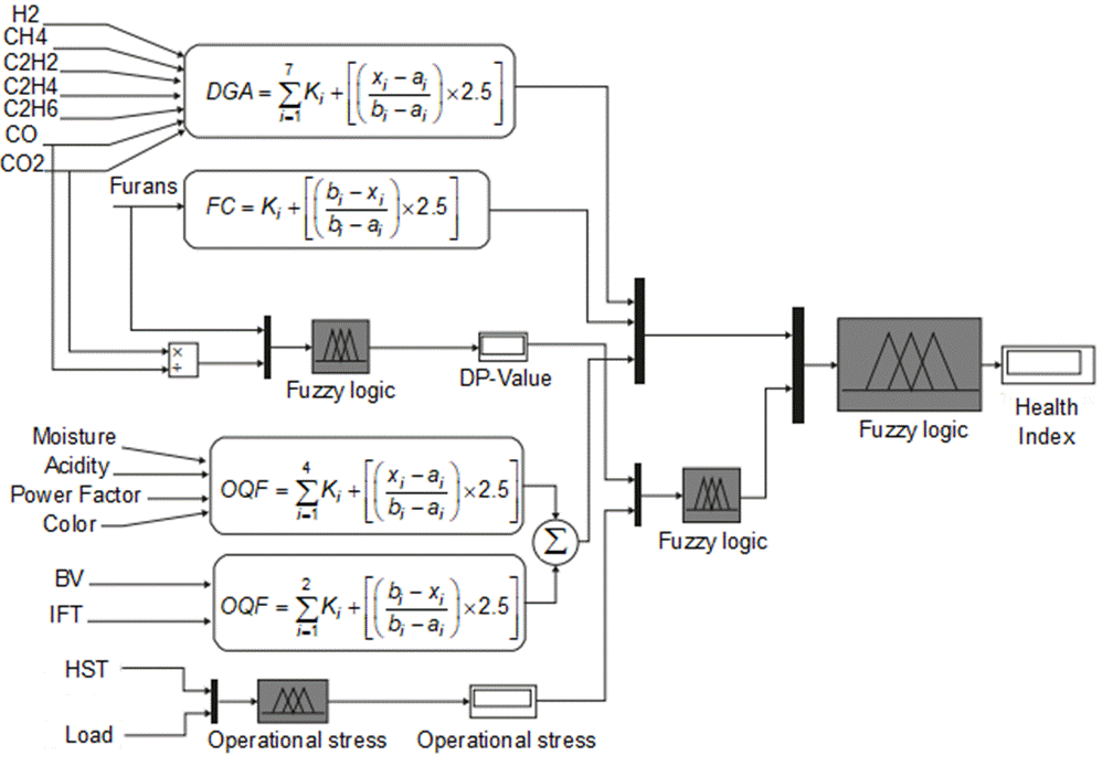 The WSM component scores results of DGA, OQF and FC analysis, while the four FISs are implemented for different purposes. The first FIS evaluates the degree of polymerization (DP) based on the FC and the carbon dioxide (CO2) and carbon monoxide (CO) ratio. The second one assesses the operational stress of the PT, which depends on the load and the hotspot temperature. The third FIS combines the results of the previous two FISs, i.e., it combines the obtained scores for DP and operational stress. Afterwards, the four and last FIS uses the outputs of the WSM and the third FIS to obtain HIWSM-FIS finally.