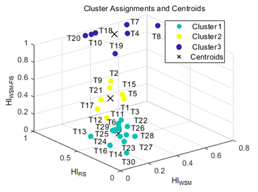 As mentioned above, a clustering technique was applied to combine HI results. Figure 8 shows the clusters representing the three methods and the centroids of the k-means technique.