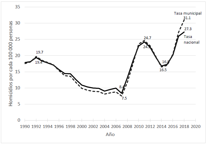La línea negra en la Figura 1 retoma datos del Instituto Nacional de Estadística y Geografía (Inegi, 2019), y muestra la tendencia en la tasa de homicidios en México de 1990 a 2018. Como puede verse, antes de que Calderón asumiera el cargo presidencial a finales de 2016 la tasa de homicidios iba en decremento, yendo de una cifra de 19.7 por cada 100 000 habitantes en 1992, al mínimo de 8.4 por cada 100 000 habitantes en 2007. Posteriormente se disparó hasta el máximo de 24.2 por cada 100 000 habitantes en 2011, una cifra mayor a cualquier punto de las cuatro décadas posteriores.