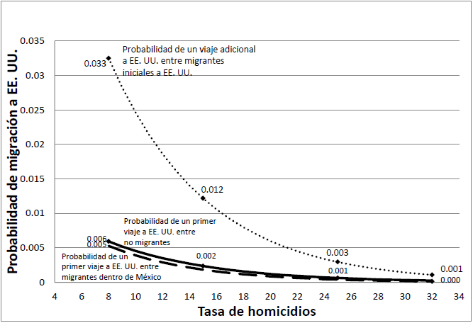 La línea discontinua justo debajo de la línea continua muestra cómo el incremento de la tasa de homicidios influye en la probabilidad de emprender un primer viaje indocumentado a Estados Unidos entre quienes han regresado de un primer viaje dentro de México. La probabilidad de viajar a Estados Unidos de manera indocumentada es básicamente la misma para los migrantes internos, que han viajado antes dentro de México, que para los no migrantes, cayendo de un valor de 0.005 con una tasa de homicidios de 8 por cada 100 000 habitantes, a 0 con una tasa de 32 por cada 100 000 habitantes. Como habría de esperarse, la probabilidad de partir a Estados Unidos. en un viaje indocumentado adicional es mucho mayor entre aquellos migrantes que ya han estado previamente en Estados Unidos.