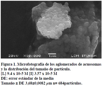 La microfotografía MEB de la Figura 1 muestra a los acuosomas (L= 9.4 x 10-5 M, I= 3.57 x 10-5 M) en forma de aglomerados de tamaño promedio de 3.68 μm con una desviación estándar de 0.0082 μm, sin embargo, las estructuras esféricas que los conforman son de un tamaño que oscila alrededor de las 0.5 μm, lo que podría considerarse dentro del intervalo de nanopartículas.