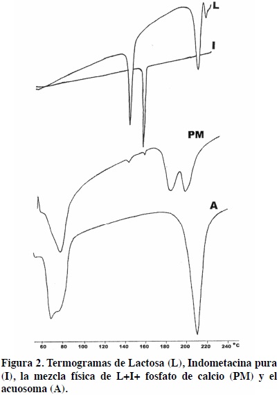 La Figura 2 muestra los termogramas de (I) y de (L). La indometacina (I), presenta sólo una endoterma (162oC) correspondiente a la fusión de la misma. Por su parte, (L) presenta una señal a 151 oC que está asociada a la pérdida de agua, y una señal a 219 oC que corresponde a la fusión de (L). En el intervalo de estudio en el cual se analizaron las muestras (50 -260oC), no se observó señal alguna correspondiente al núcleo inorgánico de fosfato de calcio. A su vez, se estudió el comportamiento de la mezcla física (PM) de núcleo inorgánico, (L) e (I), la cual muestra pequeñas señales a 148oC y 160oC, que pueden atribuirse a la (L) e (I) respectivamente, así como tres endotermas anchas a 75, 190 y 203oC, que pudieran resultar de las interacciones entre los componentes. La existencia de interacciones entre (L) e (I) ya han sido informadas en la literatura.13 Por su parte, los acuosomas (A) muestran una endoterma ancha a 77.9oC y un punto de fusión a 205.6 oC. El perfil de este termograma apunta a un arreglo molecular distinto entre los compuestos orgánicos al presentado por la mezcla física (PM).