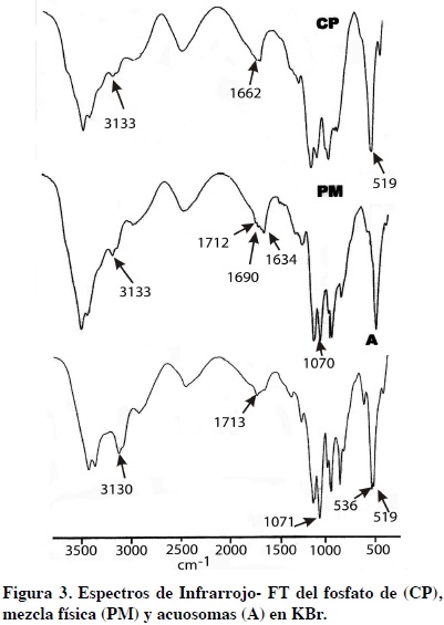 La Figura 3 muestra los espectros de infrarrojo -FT del núcleo inorgánico de fosfato de calcio (CP), la mezcla física (PM) de los componentes del acuosoma y las señales de los acuosomas (A).