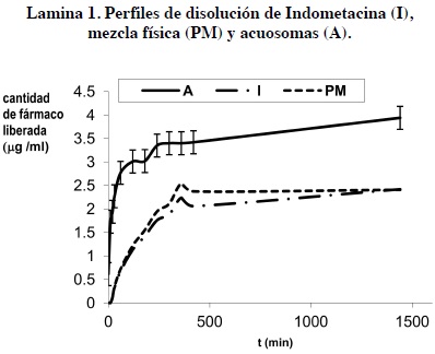 La Lamina 1 muestra el comportamiento de liberación tanto de (I), (PM) y de (A). En comparación con la mezcla física (PM) los acuosomas liberaron en los primeros veinte minutos, doce veces más indometacina. A partir de los 400 minutos y hasta las 24 horas, se mantuvo esta liberación en una relación 1.6 a uno.