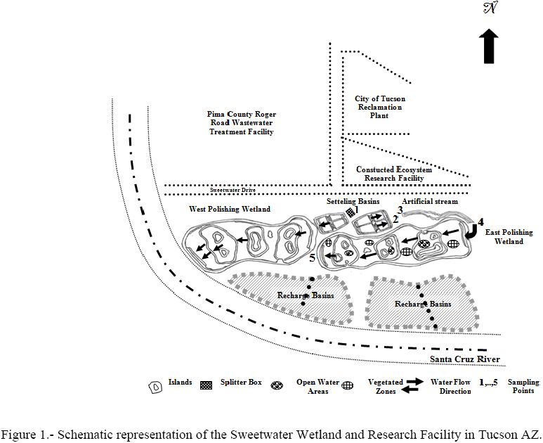The research was conducted at the Sweetwater Wetland and Recharge Facility (SWRF) in Tucson, AZ. In this site (Figure 1), two polishing wetland systems referred to as East and West were designed in about 12.46 ha to reclaim backwash water from the City of Tucson Reclamation Plant. At this site, residual chlorine in secondary effluent at the pressure mixed media filters was on average 1 mg L-1. After backwashing mixed media filters, the backwash effluent was kept free of chlorine additions. At the wetland facility, both the East or West polishing systems consist of a 3-ha wetland cell and a pair of settling basins vegetated with bulrush species (Scirpus spp.) and cattail (Typha domingenses). However, in the East Polishing System (EPS), wastewater flows briefly through an artificial stream before entering the 3-ha wetland cell for additional wastewater treatment. A sequence of islands of different sizes, shallow vegetated zones, and 1.2-m deep open water areas is the geometric configuration of the wetland to provide tertiary treated wastewater. After wetland treatment, polishing wastewater goes by gravity to four recharge basins, located at the vicinity area of The Santa Cruz River, for soil aquifer treatment. Eventually, drilling wells pump reclaimed water from the aquifer to the Pima County Roger Road Wastewater Treatment Facility (RRWTF) for chlorine disinfection and deliver in parks, schools, and golf course fields. In spite of both polishing systems were designed to treat backwash water, chlorinated secondary effluent from RRWTF was introduced for starting wetland operation in October 1997; on April 1998, the polishing wetland systems began to treat backwash water. In the winter 1999, wetland vegetation was harvested from the EPS; however, by the end of Spring a new complete plant canopy had taken its place. From February to September of 1999 and 2000, water samples were collected monthly from the EPS at the backwash splitter box (1), outlet of the south settling basin (2), both ends of the stream (3 and 4), and outlet of the wetland cell (5). Concurrently, measurements of water temperature (T°), biochemical oxygen demand (BOD5), total suspended solids (TSS), SO4, C1-, total and free chlorine (C12), turbidity, pH, native coliphages (NC), and total (TC) and fecal coliforms (FC) were conducted by using standard methods for water and wastewater analysis (APHA/AWWA/WEF, 1998).