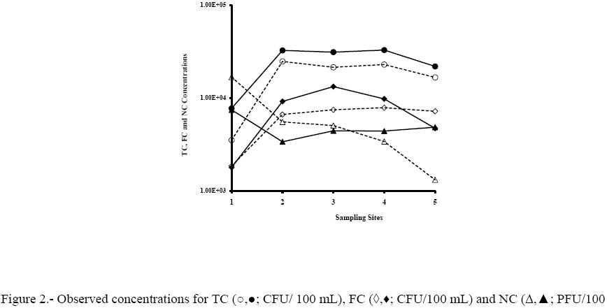 The Statistical Package for Social Science 12 (SPSS Inc., Chicago ILL) was used to conduct the statistical analysis for physical, chemical and microbial data sets. Tests to determine significant differences between sampling periods and monitoring sites were conducted by two way ANOVA analysis. Because of extreme concentration values and high variability into microbial data sets, ANOVA analysis was conducted transforming microbial concentrations to base 10 logarithmic units (log10). The geometric mean was used as a centiality measure for observed microbial indicator distributions. Extent of data dispersion was represented by geometric coefficient of variation, (10^ (σ) - 1) × 100 where σ is the standard deviation of log10 transformed microbial concentration values. The physical/chemical data sets were analyzed without transformation.