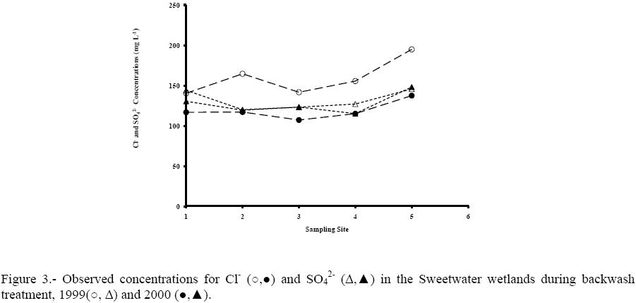 Chloride is considered highly stable in most terrestrial environments. In wetlands, its total mass is approximately constant (Kadlec and Knight, 1996) because its incorporation in plant tissues is negligible (Hayashi et al., 1998). Consequently, C1- has been used as a conservative tracer to estimate evapotranspiration in wetland ecosystems (Hayashi et al, 1998). In the 3-ha polishing wetland, evapotranspiration may be a suitable mechanism for Cl" augmentation during both backwash sampling periods when water flow rate was below 0.42-m3 min-1. Concentrations of C1- at both ends of the polishing wetland increased 25 and 19 % during backwash operation, before and after vegetation removal, respectively. ANOVA analysis indicated that only in 1999 was there a significant (p<0.05) statistical difference between inflow and outflow concentration from the 3-ha wetland cell. Sulfate is an essential nutrient for plants; thus, it can be retained by plant uptake in terrestrial environments; however, it is rarely a limiting factor for plant growth in wetlands (Kadlec and Knight, 1996). Its presence in high organic content environments induces production of hydrogen sulfide because SO4-2 is an electron acceptor for sulfur-reducing bacteria (Maier, 2000). This microbiological mechanism probably was responsible for reduction of SO42- in the settling basin, mainly observed during 1999 backwash water treatment. Similar to Cl", an increase of SO4 2- concentration occurred at the outflow of the wetland.