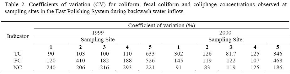 Geometric mean concentrations for total coliforms, fecal coliforms, and coliphage observed at monitoring sites during backwash water study are presented in Figure 2. It can be clearly seen that TC and FC average concentrations increased in the settling basin. The remaining wetland treatment units resulted in further bacterial removal. At the system outflow, inflow NC concentrations decreased by about 97 and 35% in 1999 and 2000, respectively. Table 2 illustrates the high variability observed in microbial concentrations particularly in the first sampling period when geometric coefficient of variation (CV) ranged between 90 and 633% for TC and from 120 to 526% for FC. The ANOVA analysis revealed a significant difference for microbial indicator concentrations between sampling sites (p<0.05) but not for sampling periods (p>0.05).