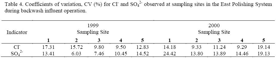 From April to September 1999, ANOVA analysis indicated that Claverage influent concentration was 141 mgL-1 increasing significantly (p<0.05) to 164 mg L-1 at site 2 (Figure 3). Thereafter, its concentration was 142 and 155 mg L-1 at site 3 and 4, respectively. At 5, a significant increase (p<0.05) of 40 mg L-1 above site 4 concentration was recorded. During the 2000 backwash sampling period, lower C1- concentrations than in 1999 were observed at monitoring sites. ANOVA analysis revealed a statistical difference (p<0.05) between both backwash water periods for C1-, in fact, a 16% difference between sampling periods for influent C1- concentrations at site 1 was estimated; for SO4, this estimate was 11 %. Table 4 gives coefficients of variation for Cl" and SO4; it seems clear that observed concentrations for both parameters showed a lower variation than the other water quality indicators (TC, FC, NC, TSS, BOD5 and turbidity). For example, in 2000, the calculated CV at the system outflow was about 19 % for both C1- and SO4 which is similar to the lowest CV estimated for TSS, BOD5 and turbidity in the polishing system during backwash water treatment. In the same effluent, water pH ranged from 7.4 to 7.5 at sampling sites 1 to 3; whereas, at the wetland outflow pH decreased, no significatively (p>0.05), to 7.35. Regarding residual C12, its concentration was below the method detection limit at the sampling sites during the backwash water treatment study.