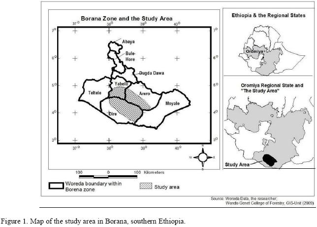 The study was conducted in the districts of Arero, Dirre and Yabello in the Borana rangelands of southern Ethiopia. The Borana rangelands cover a total area of approximately 95,000 square kilometer (Coppock, 1994). The northern parts of the Borana rangeland is bordered by Jemjem high forest landscape with a combination of Arsi and Guji Oromo land use systems. The southeastern and south limit of the Borana rangeland extends to the Ethio-Somalia and Ethio-Kenya borders, respectively (Figure 1). Generally, the elevation of the Borana rangelands is within the range of 1000 - 1500 meter above sea level with few hills up to 2000 m.a.s.l. (Coppock, 1994).