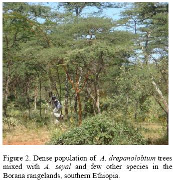 In the Borana rangelands of southern Ethiopia, the proliferation of indigenous invasive woody species has been widespread since the last four decades threatening the cattle based pastoral economy and the livelihood security of most inhabitants. Generally, many invasive woody species have been documented in the southern rangelands of Ethiopia (Assefa et al., 1986; Tamene, 1990; Coppock, 1994; Oba et al., 2000; Gemedo et al., 2006; Angassa and Oba, 2008b). According to Tamene (1990), most invading woody species are thorny plants, particularly the Genus Acacia. Acacia drepanolobium, commonly known as a whisthing thorny plant (family Fabaceae) is one of the indigenous species widely distributed in the Borana rangelands. The species is believed to be native to northeast tropical Africa including Ethiopia and other East and central African regions (USDA, ARS, National Genetic Resources Program, 2008 and ILDIS, 2008). However, the species for several reasons is notoriously invading the Borana rangelands and emerging as an indigenous invasive woody plant in the southern region of Ethiopia (Tamene, 1990; Coppock, 1994).