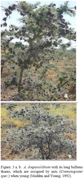 Another peculiar feature of A. drepanolobium is its association with populations of symbiotic ants (Young et al., 1997; Young and Okello, 1998), with several impacts on the ecology of grazing (Oba, 1998). On the contrary, earlier evidence (e.g. Okello et al., 2001) has also shown that A. drepanolobium might be used for charcoal making and as feed for some browsers. Furthermore, Limenih (2005) has reported that its Gum could be collected and traded as Gum Arabic for income generation by pastoral households.
