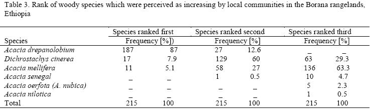 The findings of our results show that saplings and seedlings of A. drepanolobium were expanding in abundance and frequency by dominating other species in the rangelands of Borana. The IWSR for A. drepanolobium was very high (3.02), suggesting that the species is largely expanding throughout the study area, posing a major threat to rangeland resources and local livelihood system. Similarly, previous research (e.g. Angassa and Oba, 2008) has reported that A. drepanolobium is among the most encroaching species with a high IWSR. The ecological mechanisms for that might be complex (Riginos and Young, 2007) as tree growth depends on several factors. These characteristics and the indicative trends mentioned by our respondents could signify the potential threat of A. drepanolobium as an indigenous invasive species (see Figure 3). This is in agreement with other field studies from the mid 1980s and earlyl990s (e.g. Assefa et al., 1983; Tamene, 1990; Coppock, 1994; Oba, 1998; Oba et al., 2000) and also reported by remote sensing studies on bush encroachment in this area (e.g. Hacker, 1990; Gadd et al., 2001). Others (e.g. Gemedo et al., 2006; Angassa and Oba, 2008a) suggested that vast areas of the Borana rangelands have experienced bush encroachment. These observations also corroborate well with the information generated from socio-economic surveys. Local observation suggested that A. drepanolobium and other invading woody species were expanding in abundance following the ban on bush fire related to government policy matters.