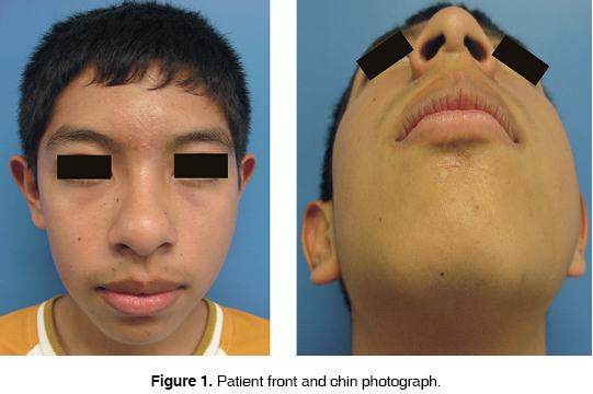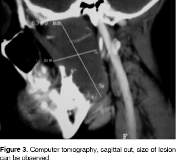 12 year old male patient attended the Maxillofacial Surgery Service of the Regional Hospital ''Lic. Adolfo López Mateos'' due to a one month evolution mass increase in the left mandibular ascending ramus. The lesion presented the following characteristics: limits the oral opening, is painful, indurated, of approximately 3 mm in diameter, non displaceable, non erythematosous, non hyperhemic or hyperthermic (Figure 1).