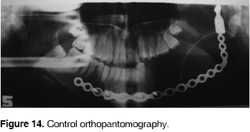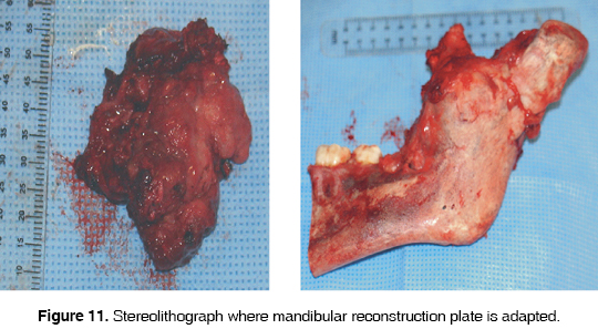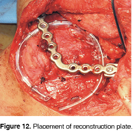 Anatomical and pathological study revealed a desmoid tumor located on the outside of the abdomen (Figure 7). Surgery was performed in the following fashion: temporal, preauricular retromandibular approach with submandibular extension to uncover left ramus and mandibular body; Tumor mass was removed from soft tissues, a hemimandibulectomy was performed with the placement of a mandibular reconstruction plate (Figures 8, 9, 10, 11, 12 y 13).