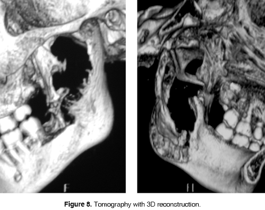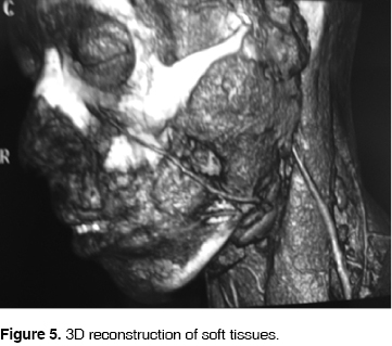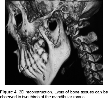 In orthopantomography evaluation, a radiolucid zone is observed in the left ramus and mandibular body, observing a third molar in proximity of the lesion region (Figure 2). A 3D reconstruction achieved through computerized tomography was requested. In it, a hypodense zone in the left mandibular ascending ramus zone was observed, as well as bone lysis and a tumor mass of approximately 6 to 8 cm diameter extending into the infratemporal fossa (Figures 3, 4 and 5).