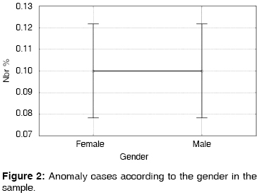 Significance levels were determined through analysis of variance to assess frequency among genders and age groups. Acknowledged significance level was p < 0.05. In the present study, dental tissue structural alterations were not taken into consideration, since encountered shapes were difficult to visualize in panoramic x-rays due to the kinetic ''flow''.