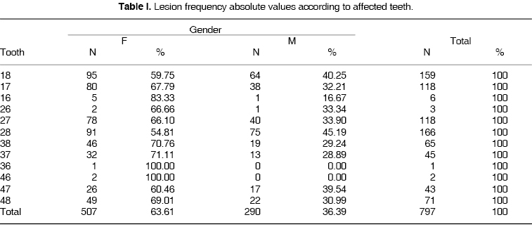 Data were transformed into percentages of number of patients, this was due to the difference found between male gender (n = 290) and female gender (n = 507). Based on these results a two-way main effect ANOVA test was conducted, to compare lesion frequency among genders according to age ranks so as to measure a future Gender-Age interaction effect (Table II).