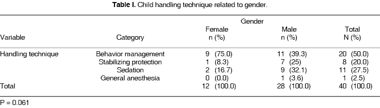 When studying behavior management techniques according to gender, females (75%) were more compliant than males (39.2%). Stabilizing protection was more frequently used for male patients (25%), whereas sedation was more used for female patients (66.6%). Conduct behavior management was the technique most used (50%), followed by sedation (27.5%) stabilizing protection (20.0%) and general anesthesia (2.5%) (Table I).