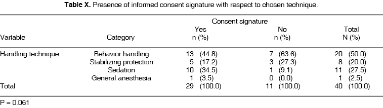 Table X shows the relationship between elected technique and presence of parental signature. 63.3% of parents did not sign approval for behavior handling technique. 27.2 did not sign approval for stabilizing technique. 34.4% of parents granted signed approval for sedation technique. 3.4 % signed approval for general anesthesia.