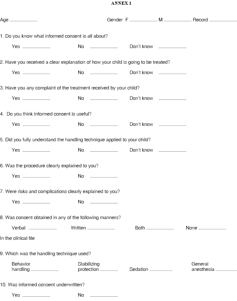 Methods used in this research project were application of a direct questionnaire to 50 parents of pediatric patients who sought service at the pediatric stomatology department of the Federico Gomez Children's Hospital in Mexico City, in the period of April-June 2007. The survey encompassed 10 questions. The first 8 questions were solved over the phone. The 2 remaining questions were solved with the help of the clinical files. This was undertaken to assess whether the pediatric dentists used informed consent forms which explain the behavior management to be conducted on the patient (Annex 1). The study did not entail any risk for the patient, since it was just an observational type study.